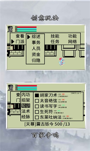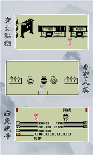 2、在游戏中玩家可以自创武功,自创门派,培养NPC,车轮单挑,3V3,开店倒卖,修仙入魔等等...所以,不仅仅是情怀,更是全新的旅程!