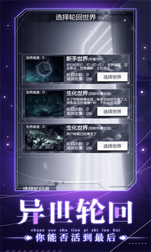 玩家在游戏中将可以使用不同的角色进入各种奇幻世界,并且每次轮回过后,还可使用得到的奖励来兑换武器道具,更好的为下一次轮回做好准备,而且游戏拥有多种结局,让玩家仿佛化身小说中的角色,在面临各种抉择面前,你会如何选择?又会创造怎样的故事呢?喜欢的无限流的玩家们不容错过!