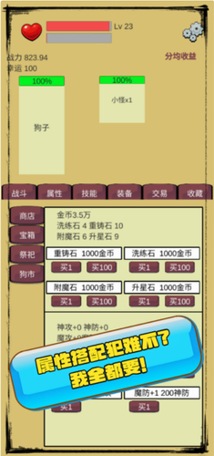 狗子放置破解版是一款非常有趣好玩的角色扮演类休闲文字游戏,游戏整体采用了相对来说比较轻松的挂机玩法,游戏的主角是一只小黄狗,玩家在游戏中要努力提升它的等级和技能,只有这样你才能面对更加强大的敌人,玩家可以在游戏中去选择各种不同的怪物难度去进行战斗,给你带来全新的体验,不断的去提升自己的等级,这样就可以让自己变大更强,挂机的战斗方式,玩起来也是非常的轻松,给你带来更多的挑战,在战斗之中不断的提升自己的实力。许多强有力武器装备需要玩家通过挂机来轻松获取,不用耗费过多时间就能享受游戏的乐趣。