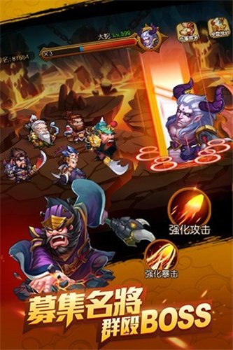 英雄冲冲冲破解版是一款卡牌类的角色扮演游戏,游戏融入了非常经典的三国元素,玩家在这个三国时代里可以招募各位英雄名将,培养他们让他们能够以一当千。游戏中有着非常多的英雄武将可以选择,武将之间有着独特的羁绊系统,处于同一个羁绊系统下的武将会在战斗时获得额外的战斗加成,让玩家可以更轻松击败BOSS。