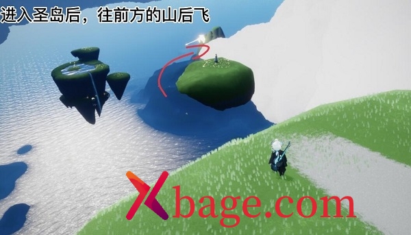 1、首先先来到云野的圣岛这里,到达之后向着前方山背后的位置飞;