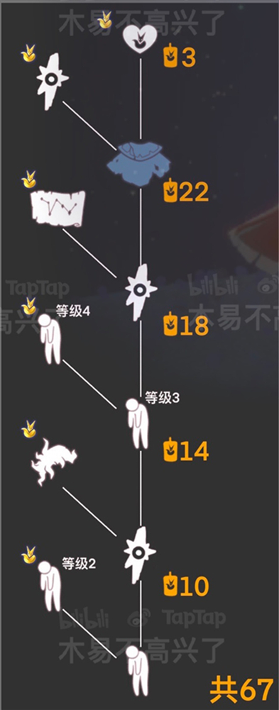 光遇酒鬼先祖兑换表一、酒鬼先祖兑换表 1、黑色垫肩斗篷,兑换要22根季节蜡烛。 2、锡纸烫短发,兑换要10根季节蜡烛。 3、乐谱,兑换要18根季节蜡烛。 4、三四级沮丧动作,升级要14根季节蜡烛。 温馨提示:沮丧的士兵物品全部兑换要67根季节蜡烛。